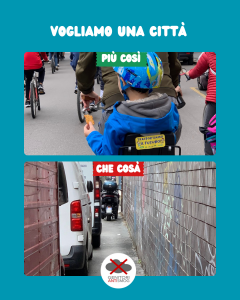 Lottiamo per una città in cui tutti, adulti, bambini e anziani, possano muoversi con sicurezza e tranquillità e in cui i genitori possano camminare sui marciapiedi con i passeggini, sicuri di non trovare ostacoli; una città in cui non ci siano barriere architettoniche e in cui lo spazio pubblico sia a misura di persone e tenga conto delle diverse esigenze e capacità dei suoi cittadini.